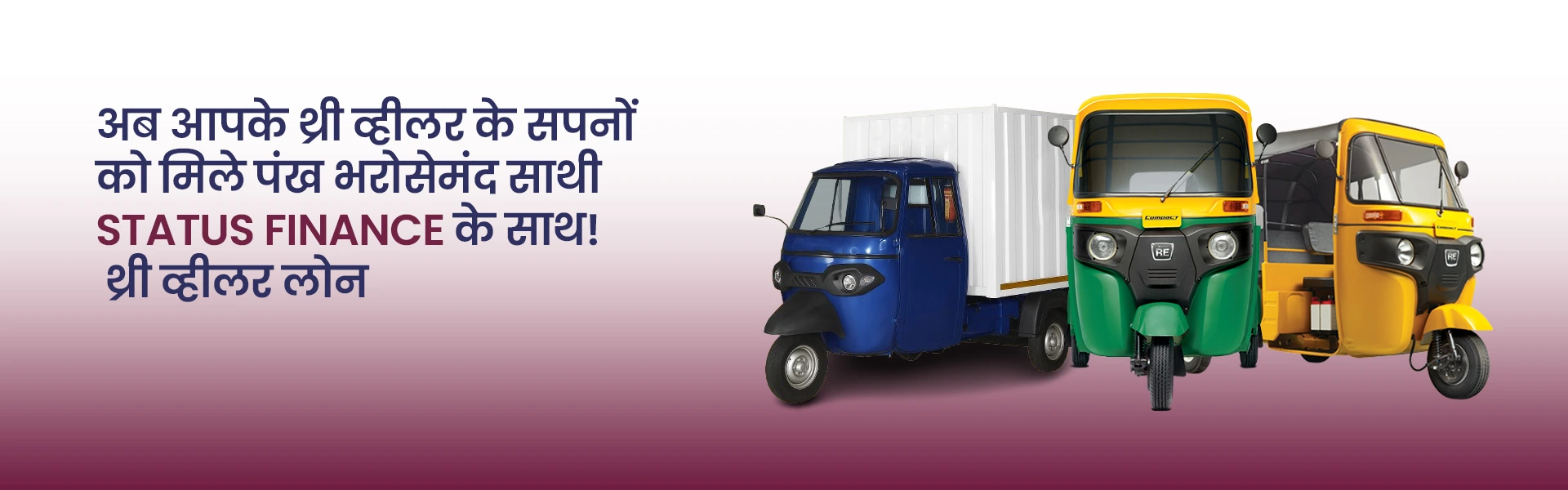 Empower your business with Status Finance's Three-Wheeler Loans. Enjoy quick approvals, competitive interest rates, and flexible repayment terms to easily finance new three-wheelers. Get the reliable vehicles you need to drive your business forward with confidence and ease.